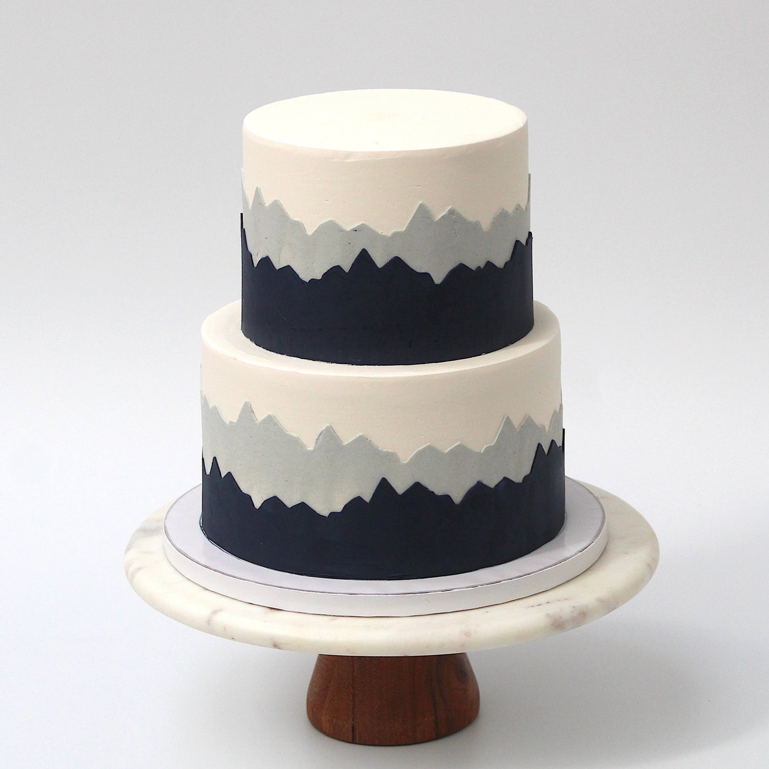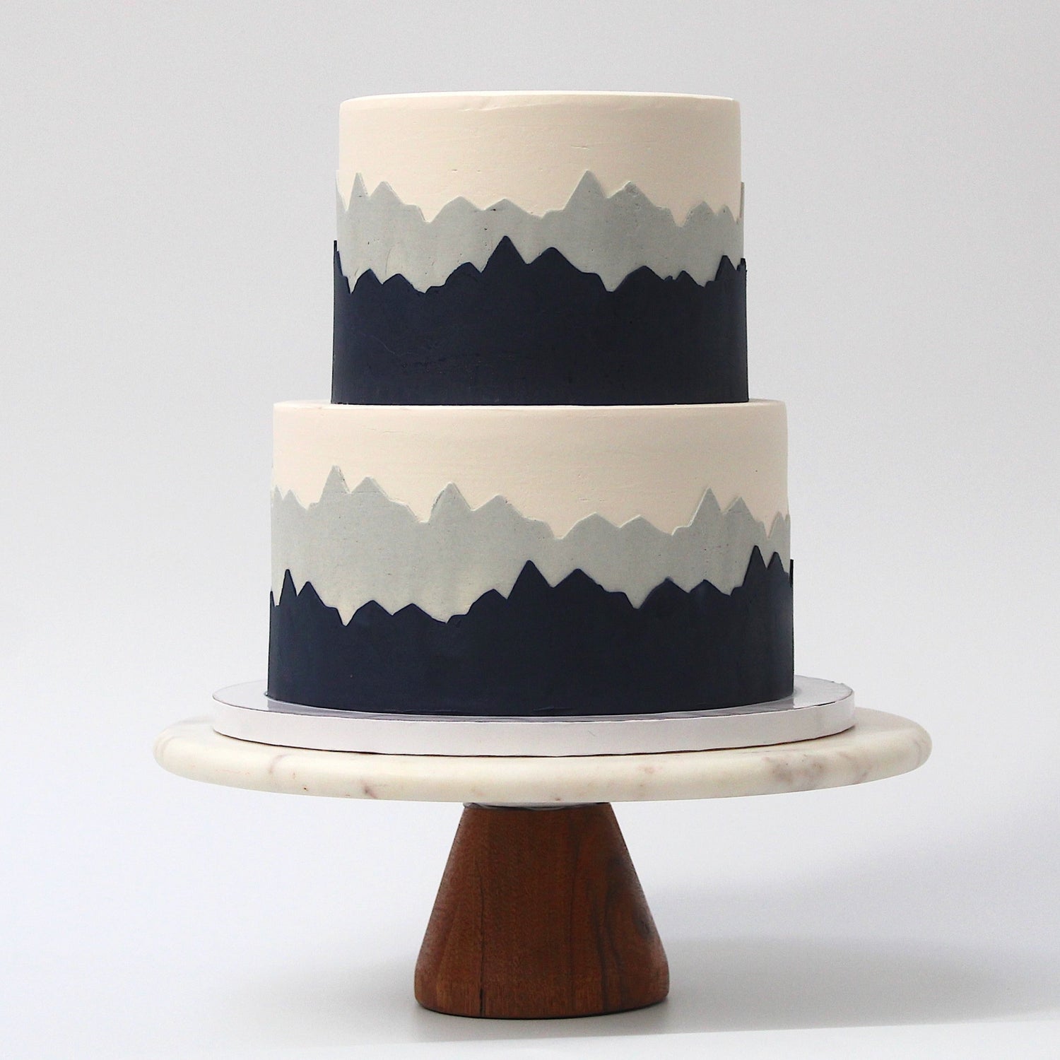Modern elegance meets natural beauty in our Mountain Mist cake. Featuring a clean, minimalist design, this two-tiered creation is wrapped in hand-painted buttercream silhouettes inspired by the Rocky Mountains. The contrasting shades of navy, slate gray, and soft ivory evoke a tranquil alpine sunrise, making this cake perfect for mountain weddings, adventurous celebrations, or lovers of Colorado’s iconic landscape.